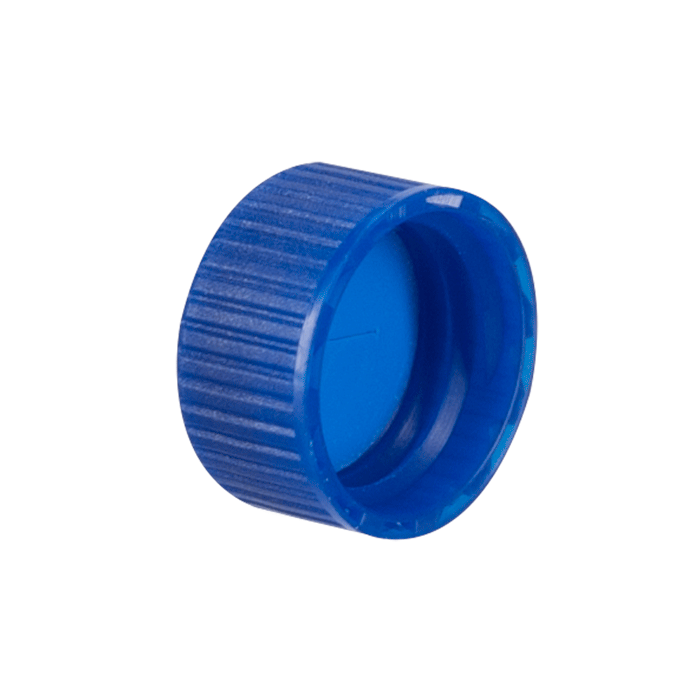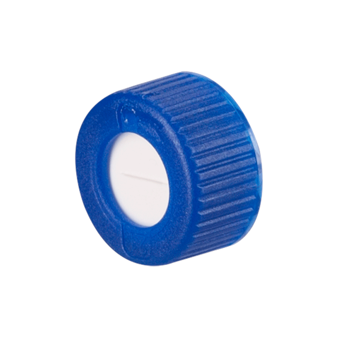 Caps, Screw Top, with Blue Silicone Rubber / White PTFE Pre-Slit Septa, fitted in "knurled", polypropylene, Blue Caps with 6mm holes. For use with 9-425 thread, 12x32mm autosampler vials. MICROSOLV Brand. 100/PK.