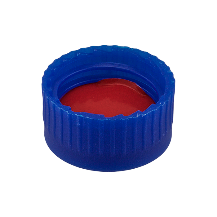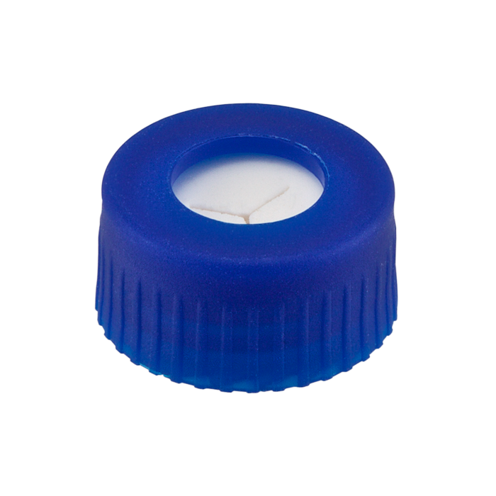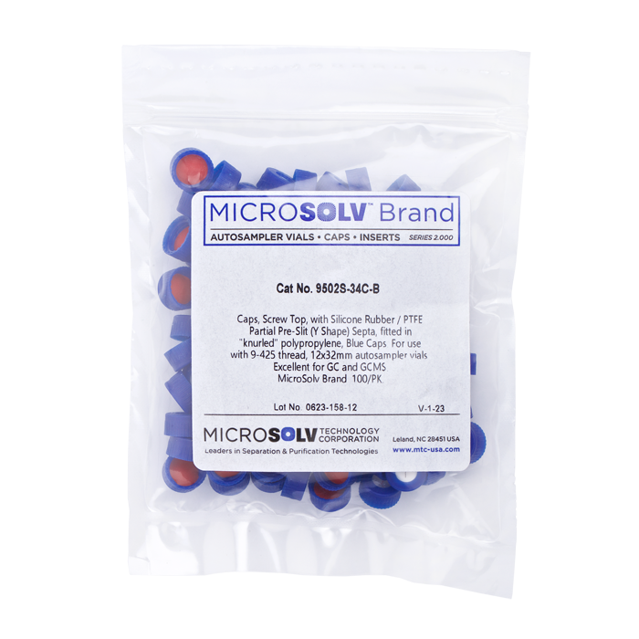 Caps, Screw Top, with Silicone Rubber / PTFE Partial Pre-Slit (Y Shape) Septa, fitted in "knurled" polypropylene, Blue Caps. For use with 9-425 thread, 12x32mm autosampler vials. Excellent for GC and GCMS. MICROSOLV Brand. 100/PK.