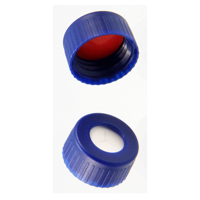 Caps, Screw Top, with Silicone Rubber / PTFE Partial Pre-Slit (Y Shape) Septa, fitted in "knurled" polypropylene, Blue Caps. For use with 9-425 thread, 12x32mm autosampler vials. Excellent for GC and GCMS. MICROSOLV Brand. 1000/CS.