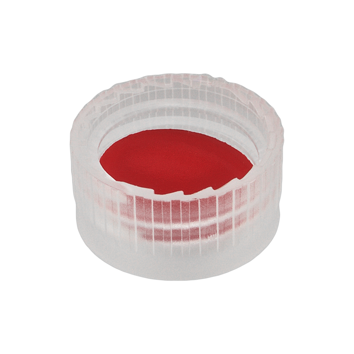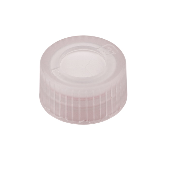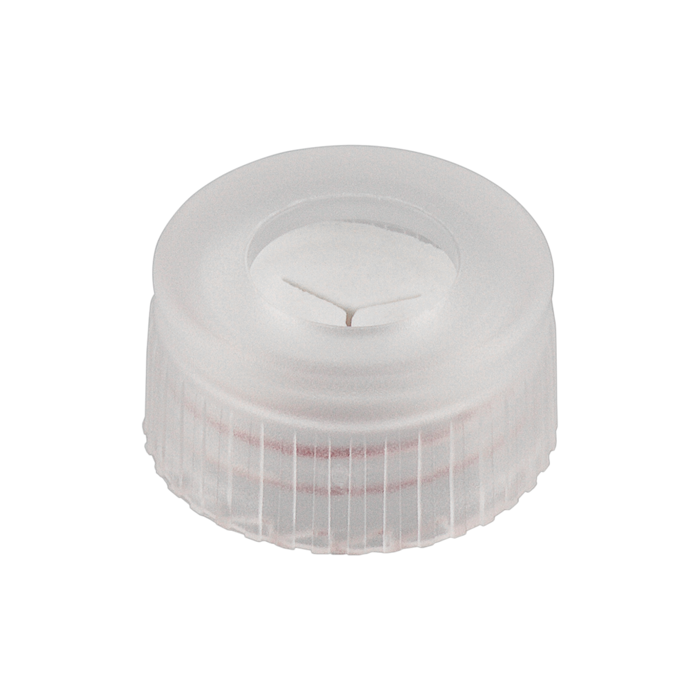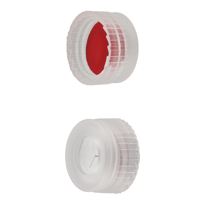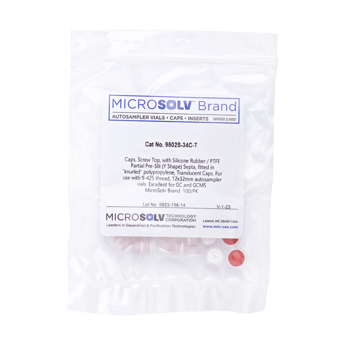 Caps, Screw Top, with Silicone Rubber / PTFE Partial Pre-Slit (Y Shape) Septa, fitted in "knurled" polypropylene, Translucent Caps. For use with 9-425 thread, 12x32mm autosampler vials. Excellent for GC and GCMS. MICROSOLV Brand. 100/PK.