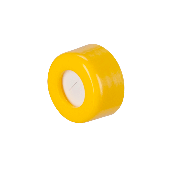 Caps, Screw Top, with Silicone Rubber / PTFE Pre-Slit Septa, fitted in smooth sided, Robo Style, soft polypropylene, Yellow Caps. For use with 9-425mm thread, 12x32mm autosampler vials. MICROSOLV Brand. 100/PK.