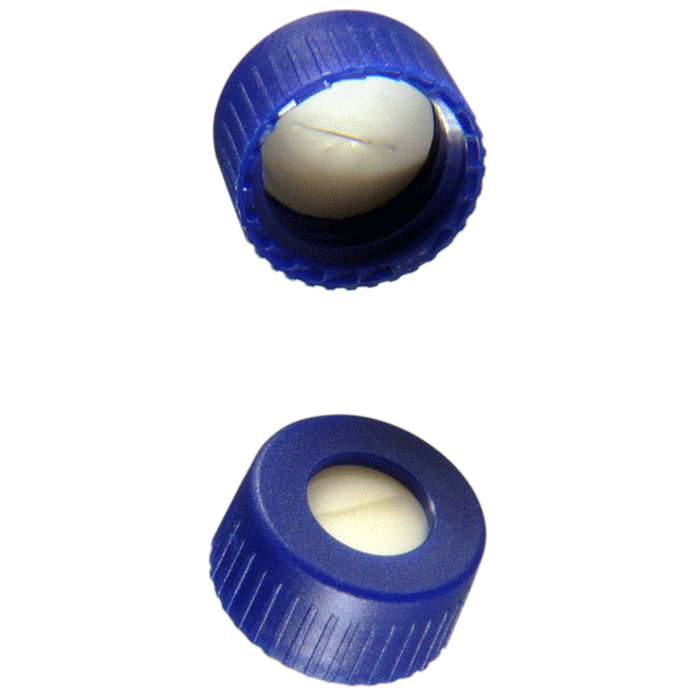 Caps, Screw Top, with Beige Silicone Rubber / White PTFE ultra-pure Septa, fitted in "knurled", polypropylene, Blue Caps with 6mm holes. For use with 9-425 thread, 12x32mm autosampler vials. MICROSOLV Brand. 100/PK.