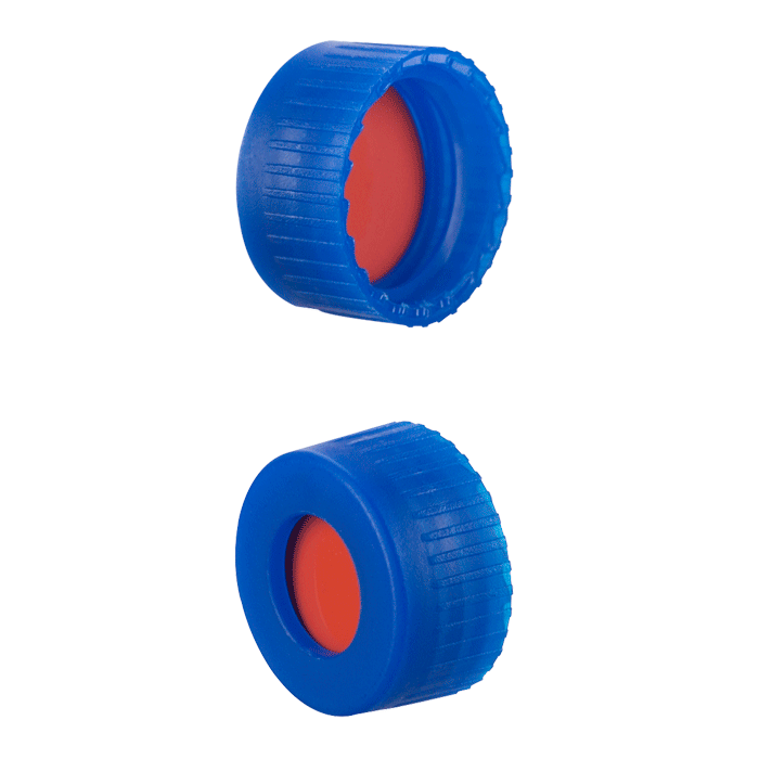 Caps, Screw Top, with Orange Red Rubber / PTFE Septa, bonded in "knurled", polypropylene, Blue Caps. For use with 9-425mm thread, 12x32mm autosampler vials. MICROSOLV Brand. 1000/CS.