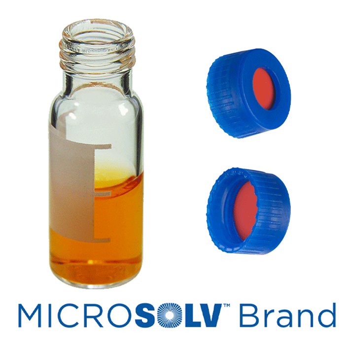 Vial & Cap Kit Includes 100 EA 2ml, Screw Top, Clear Autosampler Vials with Write-On Patch and fill lines and 100 EA matching Screw Caps with Red Rubber / PTFE Septa, bonded in the Blue Caps, MICROSOLV Brand Easy Purchase Pack. 1/PK.