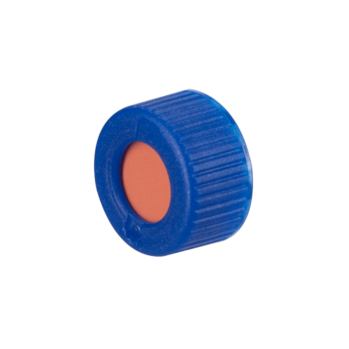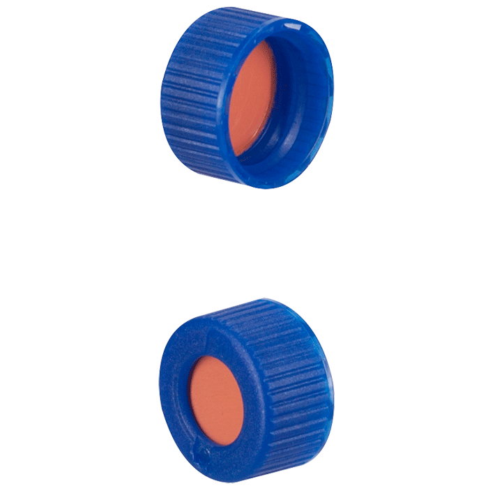 Caps, Screw Top, with Natural Rubber / TFE Septa, fitted in "knurled", polypropylene, Blue Caps. For use with 9-425mm thread, 12x32mm autosampler vials. MICROSOLV Brand. 1000/CS.