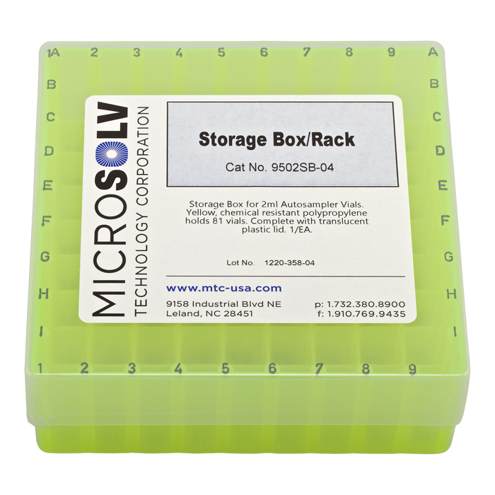 Storage Box for 2ml Autosampler Vials. Yellow, chemical resistant polypropylene holds 81 vials. Complete with translucent plastic lid. 1 EA.