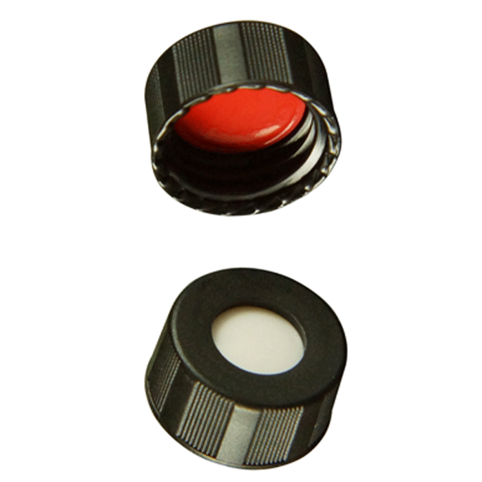 Caps, Screw Top, with Soft-Guard, White Silicone Rubber / Red PTFE Septa, bonded in "knurled", polypropylene, Black Caps. For use with 9-425mm thread, 12x32mm autosampler vials. Soft-Guard Brand. 100/PK