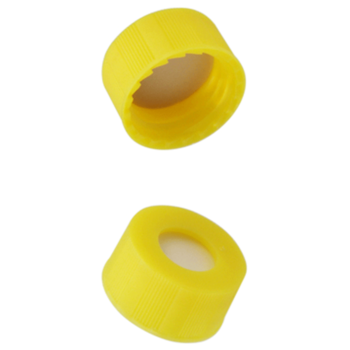 Caps, Screw Top, with White Silicone Rubber / Natural PTFE Septa, fitted in "knurled", polypropylene, Yellow Caps. For use with 9-425mm thread, 12x32mm autosampler vials. BASIK Brand. 1000/CS.