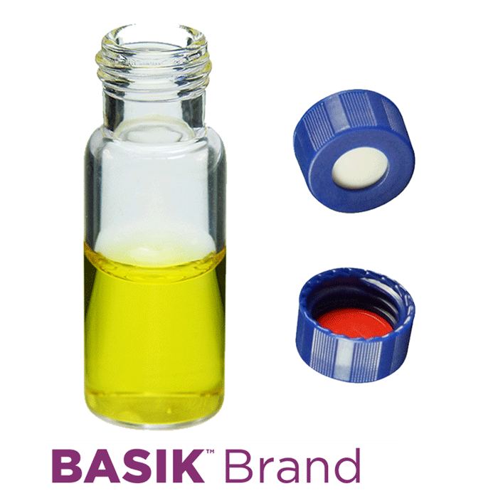 Vial & Cap Kit Includes 100 EA 2ml, Screw Top, Clear Autosampler Vials and 100 EA matching Screw Caps with White Silicone Rubber / Red PTFE Soft-Guard Septa, bonded in the Blue Caps. BASIK Brand Easy Purchase Pack. 1/PK.