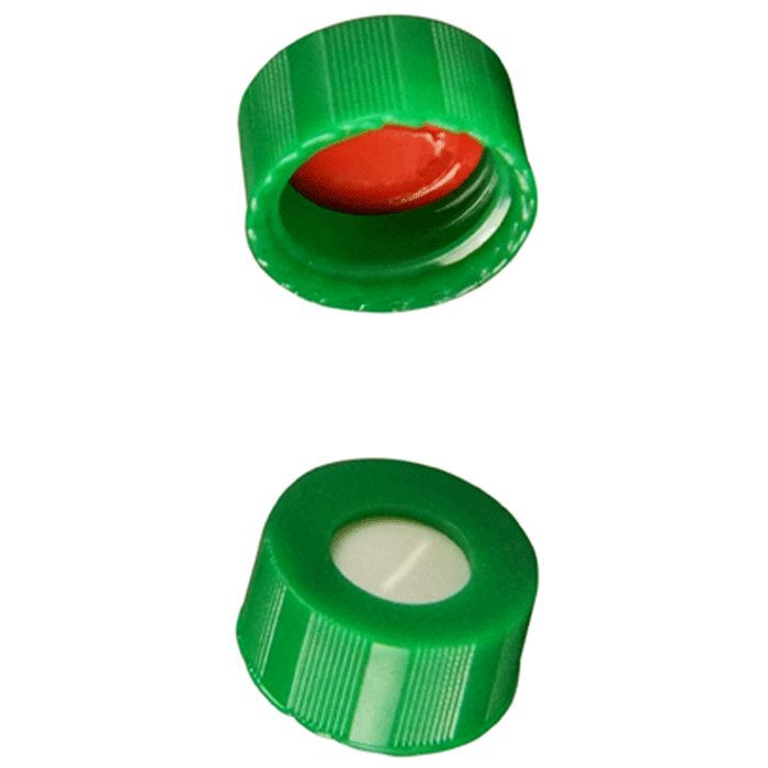 Caps, Screw Top, with Soft-Guard, White Silicone Rubber / Red PTFE Pre-Slit Septa, bonded in "knurled", polypropylene, Green Caps. For use with 9-425mm thread, 12x32mm autosampler vials. Soft-Guard Brand. 100/PK