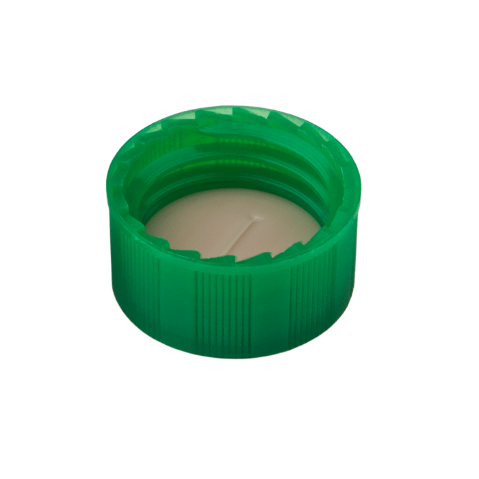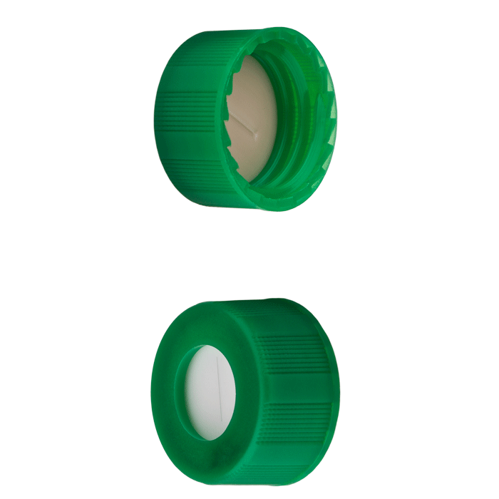 Caps, Screw Top, with White Silicone Rubber / Natural PTFE Pre-Slit Septa, fitted in "knurled", polypropylene, Green Caps. For use with 9-425mm thread, 12x32mm autosampler vials. BASIK Brand. 1000/CS.
