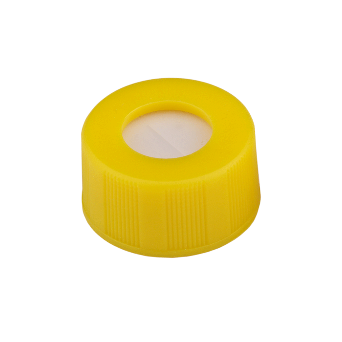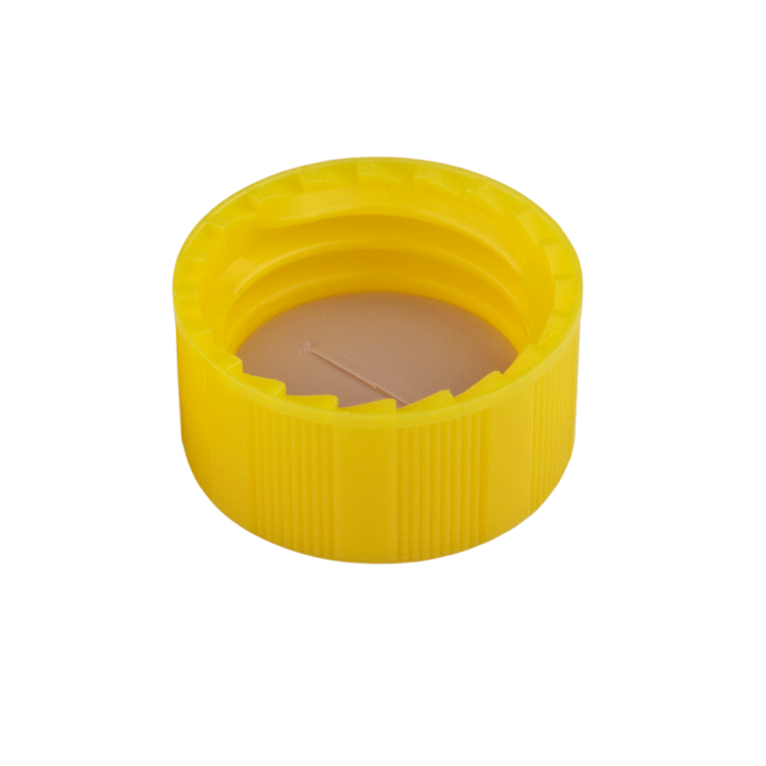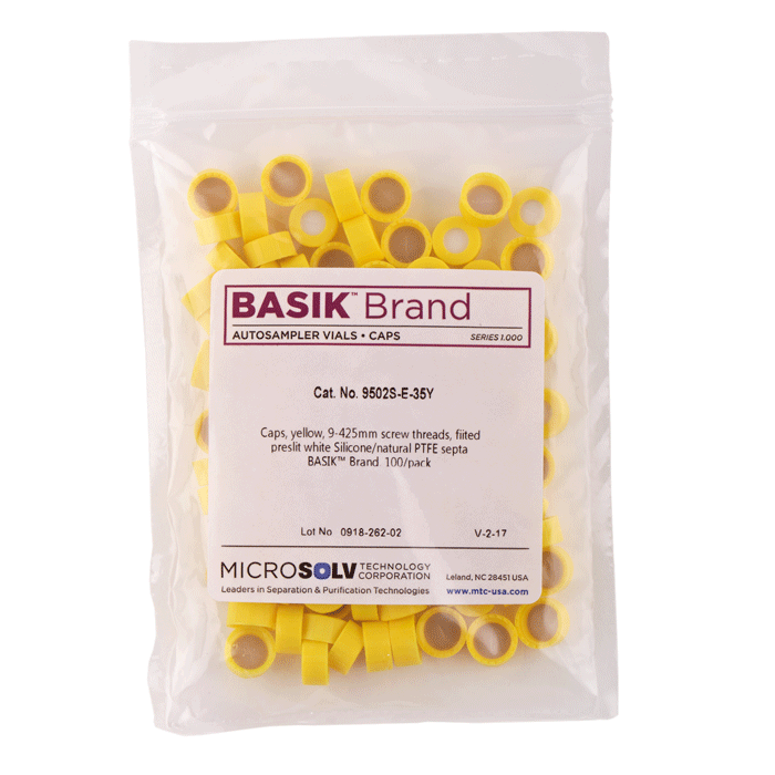 Caps, Screw Top, with White Silicone Rubber / Natural PTFE Pre-Slit Septa, fitted in "knurled", polypropylene, Yellow Caps. For use with 9-425mm thread, 12x32mm autosampler vials. BASIK Brand. 100/PK.