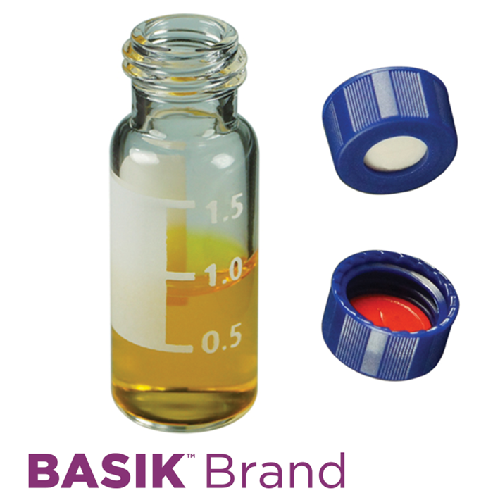Vial & Cap Kit Includes 100 EA 2ml, Screw Top, Clear Autosampler Vials with Write-On Patch and fill lines and 100 EA matching Screw Caps with White Silicone Rubber / Red PTFE Pre-Slit, Soft-Guard Septa, bonded in the Blue Caps. BASIK Brand Easy Purchase Pack. 1/PK.