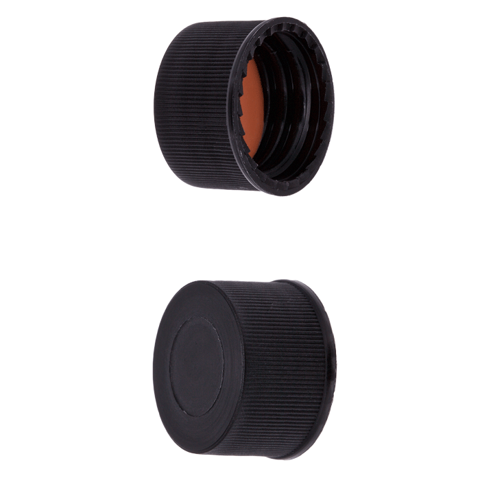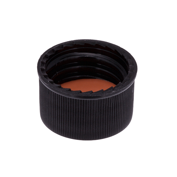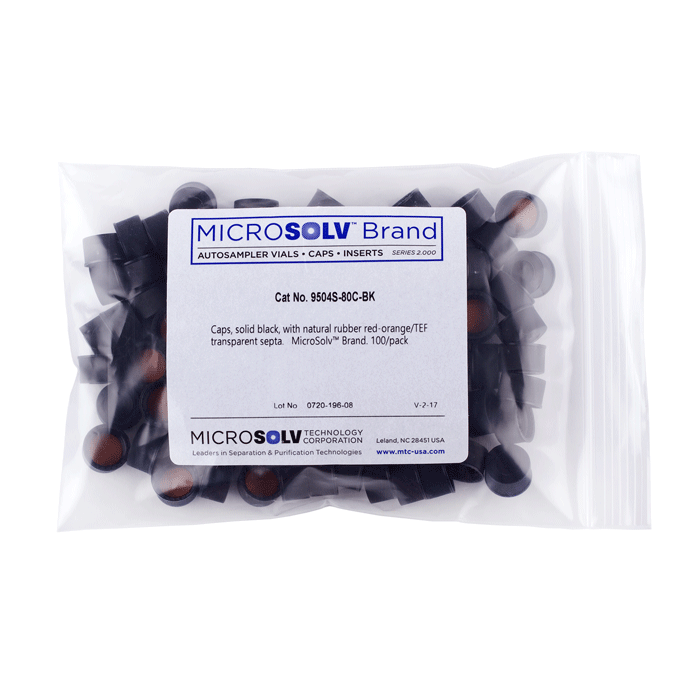 Caps, Screw Top, Solid, with a Red Orange Natural Rubber/ Transparent TEF liner, in "knurled", polypropylene, Black Caps. For use with 13-425mm thread,15x45mm autosampler vials. MICROSOLV Brand. 100/PK.