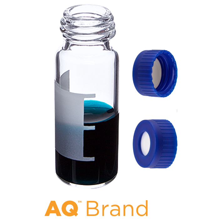 Vial & Cap Kit Includes 100 EA 2ml, Screw Top, Clear Autosampler Vials with Write-On Patch and fill lines and 100 EA matching Screw Caps with White Silicone Rubber / Tan PTFE Septa bonded in the Blue Caps. AQ Brand Easy Purchase Pack. 1/PK.
