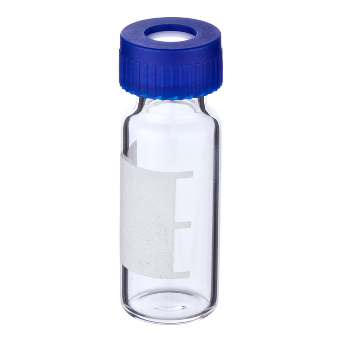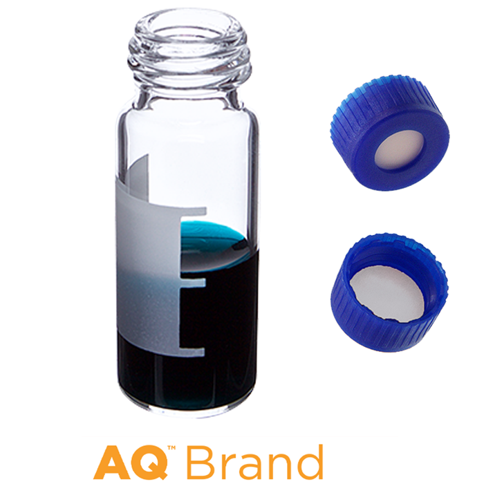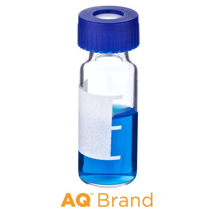 Vial & Cap Kit Includes 100 EA 2ml, Screw Top, Clear Autosampler Vials with Write-On Patch and fill lines and 100 EA matching Screw Caps with White Silicone Rubber / Tan PTFE Septa bonded in the Blue Caps. Vials and Caps are Pre-assembled. AQ Brand Easy Purchase Pack. 1/PK.