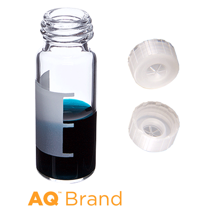 Vial & Cap Kit Includes 100 EA 2ml, Screw Top, Clear Autosampler Vials with Write-On Patch and fill lines and 100 EA matching Single injection, Screw Caps with a thinned penetration point, Natural color. AQ Brand Easy Purchase Pack. 1/PK.