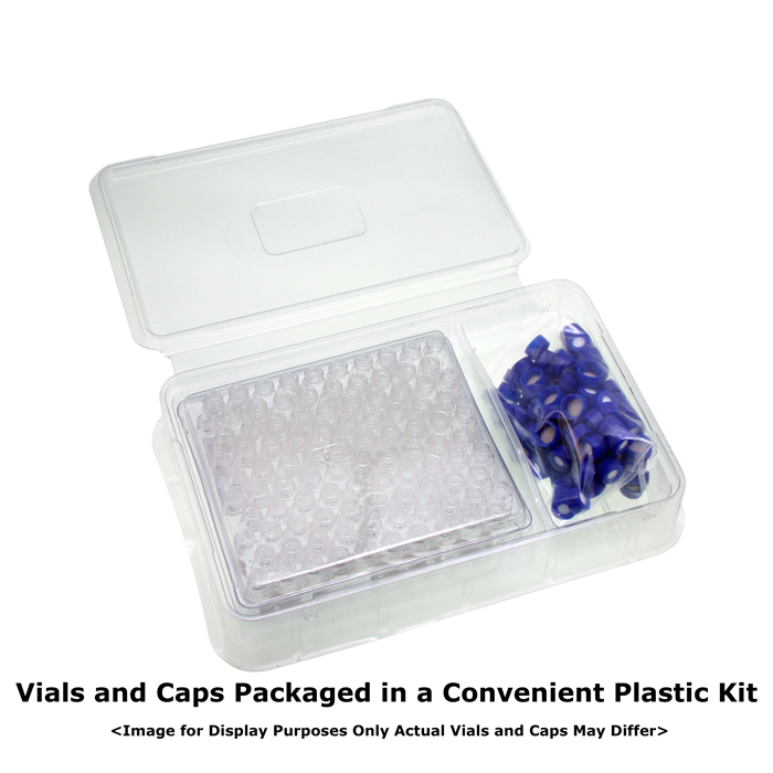 Vial & Cap Kit includes 100 EA 1.8ml, Maximum Recovery, Snap Top, Clear Deactivated Autosampler Vials and 100 EA matching Snap Caps with White Silicone Rubber / Tan PTFE Septa fitted in the Blue Caps. AQ Brand Easy Purchase Pack. 1/PK.