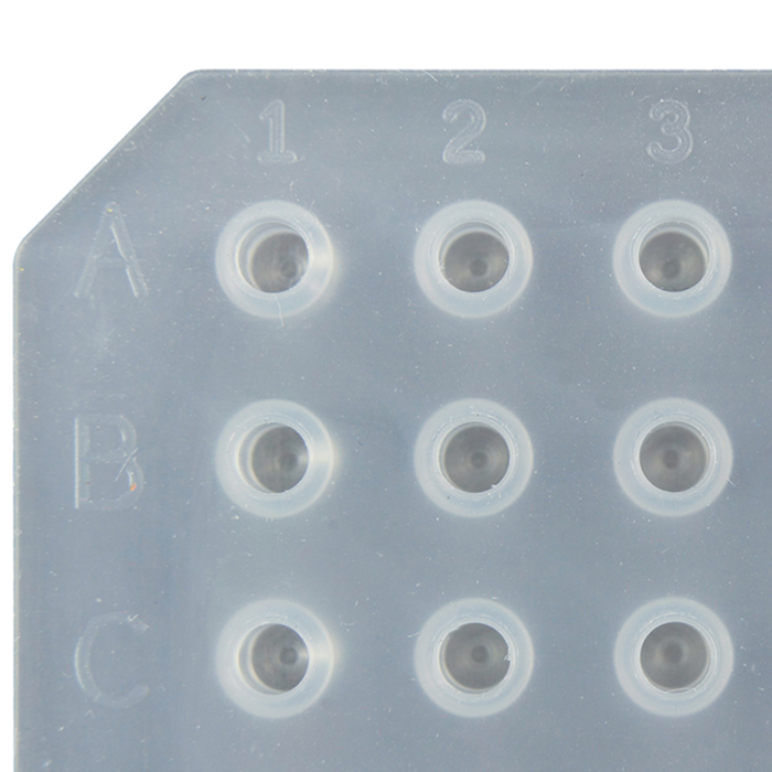 Made of ultra pure Silicone Rubber, this mat is designed and molded to seal up to 96 each 350ul Inserts in the U-2D Micro-Sample Management System. This mat is not Pre-Slit and has alphanumeric markings on the top side of the mat, along the edges for identification of the Inserts.