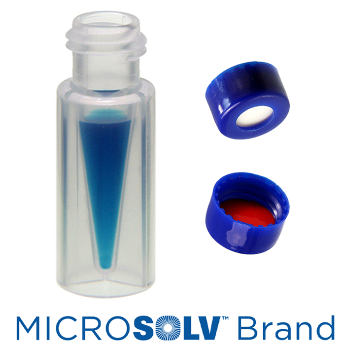 Vial & Cap Kit Includes 100 EA 300ul, Screw Top, Clear polypropylene Autosampler Vials and 100 EA matching Screw Caps with Silicone Rubber / PTFE Septa, fitted in the Robo Style, Blue Caps. MICROSOLV Brand Easy Purchase Pack. 1/PK.