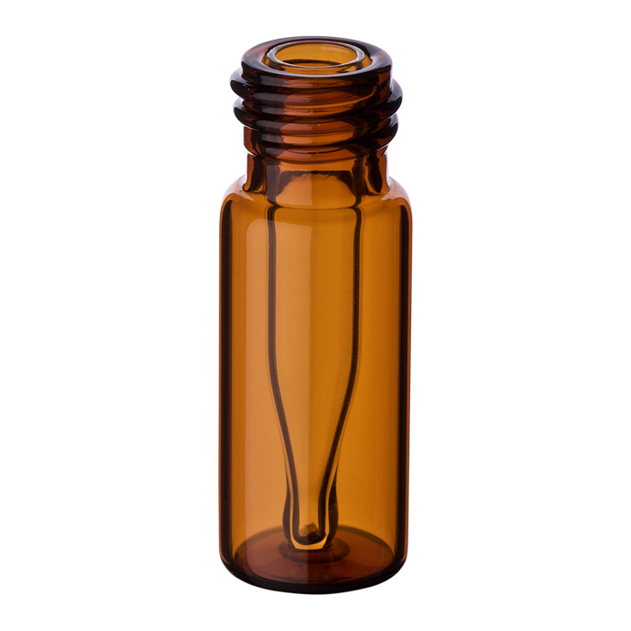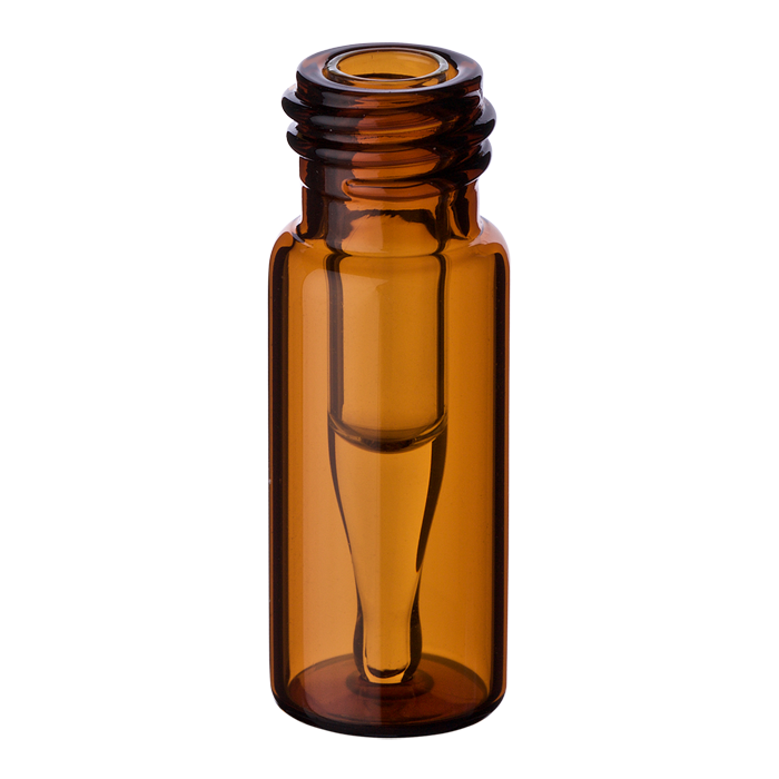 Wide mouth vials and inserts are first hydrolytic, Class A, Borosilicate Glass, 300ul total fill volume, inserts fused to the bottom of the vial. Amber vials are often used for light sensitive compounds and are considered low actinic.