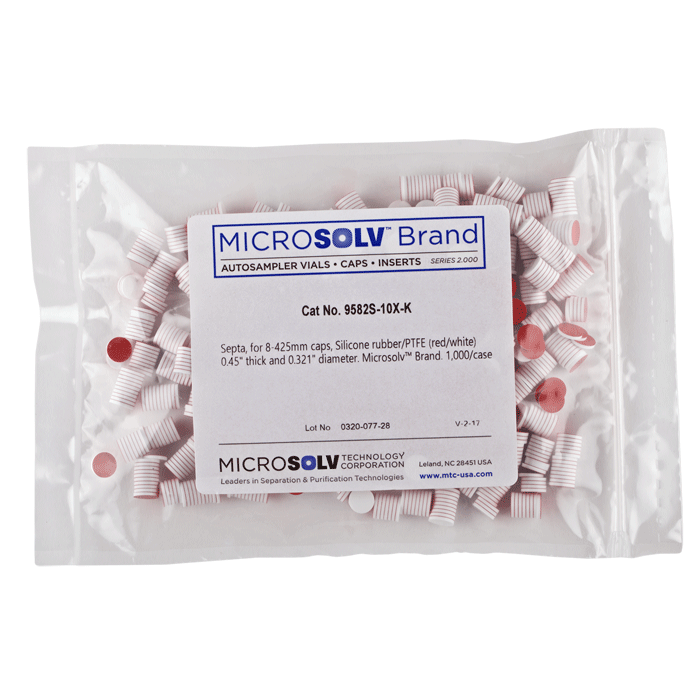 Septa, 8mm, White Silicone Rubber / Red PTFE that is 0.045" thick and 0.321" diameter for use in 8-425mm thread caps. Caps sold separately. MICROSOLV Brand. 1000/CS.