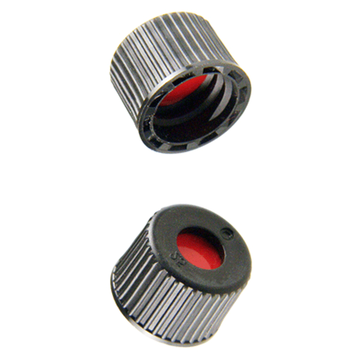 Caps, Screw Top, with PTFE / Silicone Rubber / PTFE Septa, fitted in "knurled", polypropylene, Black Caps.. For use with 8-425mm thread, 12x32mm autosampler vials. BASIK Brand. 1000/CS.
