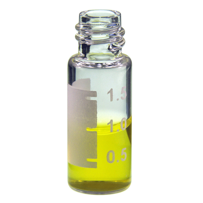 Vials, Screw Top, Glass. Clear, 2ml, with Write-On Patch and fill lines, 8-425mm threads, 12x32mm outer dimensions. For use as an autosampler vial or storage bottle. BASIK Brand. 100/PK.