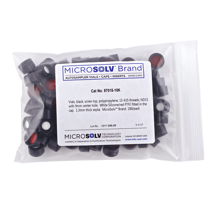 Caps, Screw Top, with White Silicone Rubber / Red PTFE Septa / Liner, fitted in knurled polypropylene, Black Caps. For use with ND15 thread, storage Vials or Bottles. MICROSOLV Brand. 100/PK.
