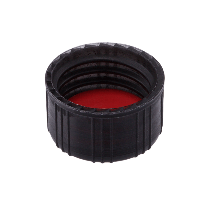 Caps, Screw Top, with White Silicone Rubber / Red PTFE Septa / Liner, fitted in knurled polypropylene, Black Caps. For use with ND15 thread, storage Vials or Bottles. MICROSOLV Brand. 1000/CS.