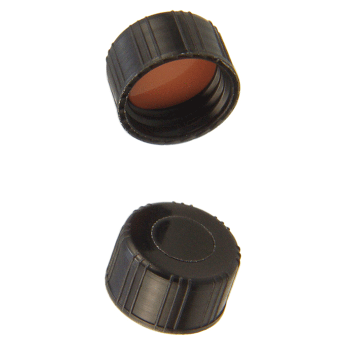Caps, Screw Top, Solid, with Red-Orange Natural Rubber / Transparent TFE Liner, fitted in knurled polypropylene, Black Caps. For use with ND15 thread, storage Vials or Bottles. MICROSOLV Brand. 100/PK.