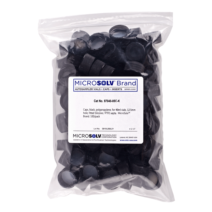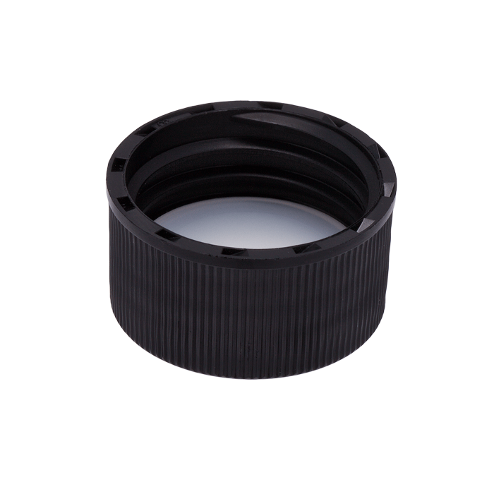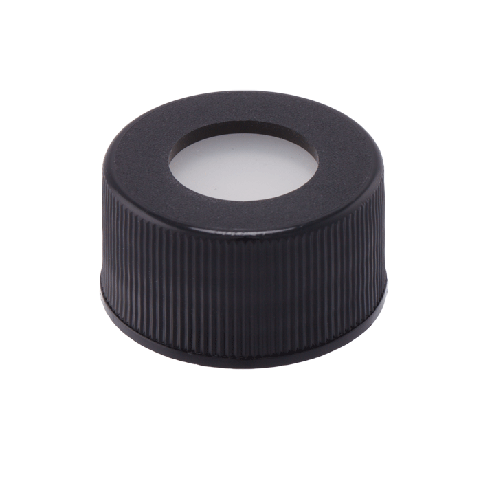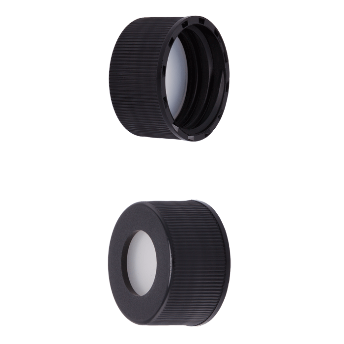 Caps, Screw Top, with White Silicone Rubber / White PTFE Septa, fitted in knurled polypropylene, Black Caps. For use with 24-414mm threaded EPA Style vials. BASIK Brand. 100/PK.