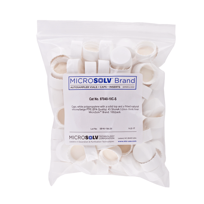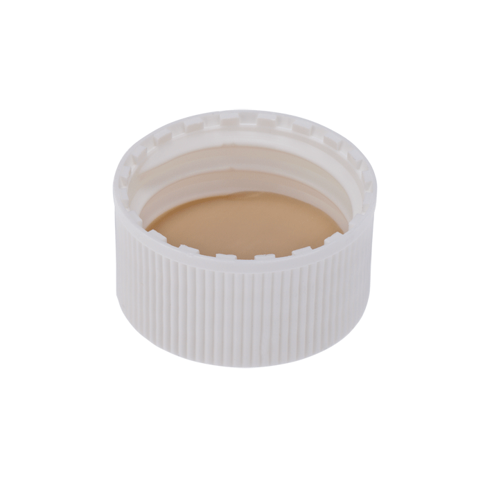 Caps, Screw Top, Solid, with White Silicone Rubber / Beige PTFE Liner, fitted in knurled polypropylene, White Caps. For use with 24-400mm threaded EPA Style vials. ND24 threads. MICROSOLV Brand. 100/PK.