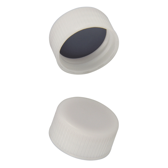 Caps, Screw Top, Solid, with Red Butyl Rubber / Grey PTFE Liner, fitted in knurled polypropylene, White Caps. For use with 24-400mm threaded EPA Style vials. ND24 threads. MICROSOLV Brand. 100/PK.
