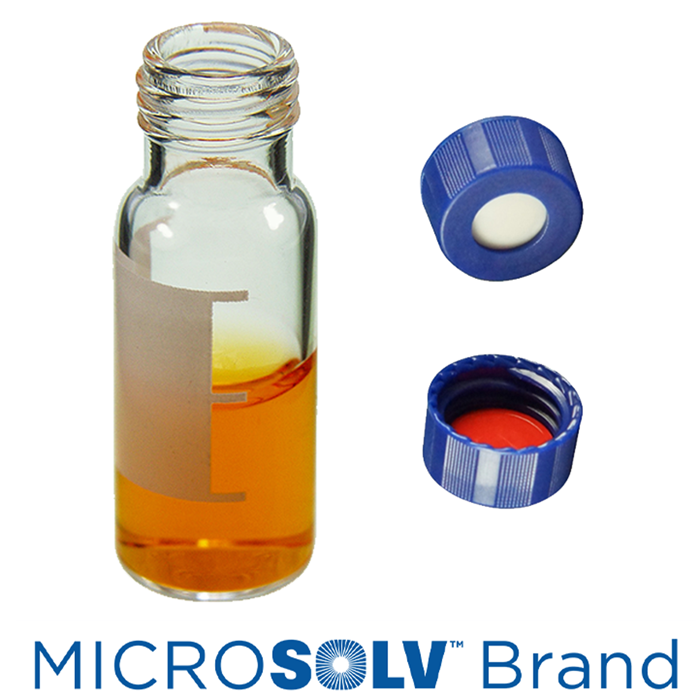 Vial & Cap Kit Includes 100 EA 2ml, Screw Top, Clear Autosampler Vials with Write on Patch and fill lines and 100 EA matching Screw Caps with White Silicone Rubber / Red PTFE Soft-Guard Septa, bonded in the Blue Caps. MICROSOLV Brand Easy Purchase Pack. 1/PK.