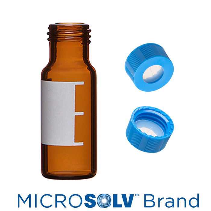 Vial & Cap Kit includes 100 EA 2ml, Screw Top, Amber Autosampler Vials with Write-On Patch and fill lines and 100 EA matching Screw Caps with Silicone Rubber / PTFE, ultra-pure Pre-Slit Septa, fitted in the Light Blue Caps. MICROSOLV Brand Easy Purchase Pack.1/PK.
