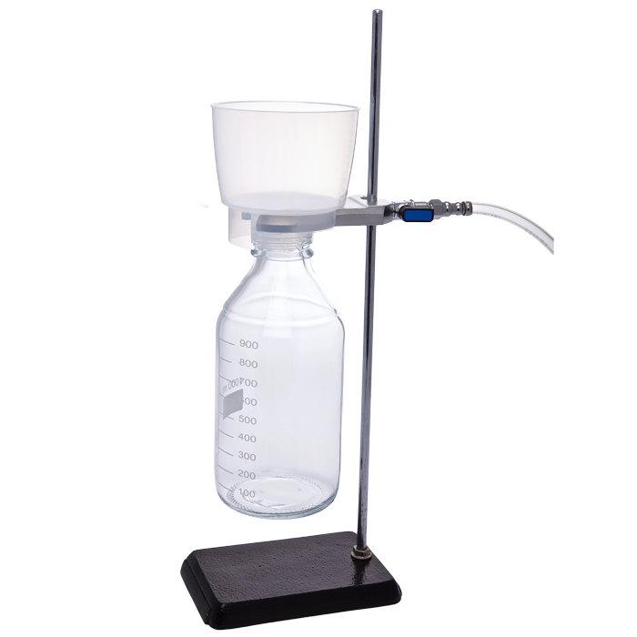 Bottle Top Vacuum Filtration Cradle Ring for SOLVFil™ Filters is made of Steel and allows for hands-free filtration, provides on/off vacuum flow control manifold, and is for use with both the 500ml and 1000ml SOLVFil bottle top filters. Designed to work with a standard laboratory ring stand and "house vacuum" or vacuum pumps.