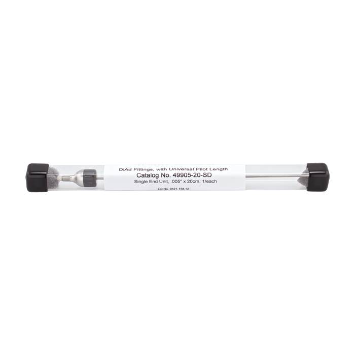 This Di-Ad™ is very convenient for laboratories that use multiple column brands and want to use 0.005" (127um) ID x 200mm (7.87") long tubing with perfect cut tips. Pressure rating for these connectors is 10,000 psi and are HPLC solvent resistant.