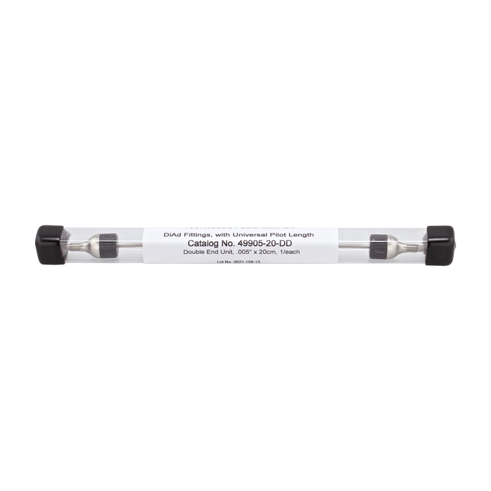 This Di-Ad™ is very convenient for laboratories that use multiple column brands and want to use 0.005" (127um) ID x 200mm (7.87") long tubing with perfect cut tips. Pressure rating for these connectors is 10,000 psi and are HPLC solvent resistant.