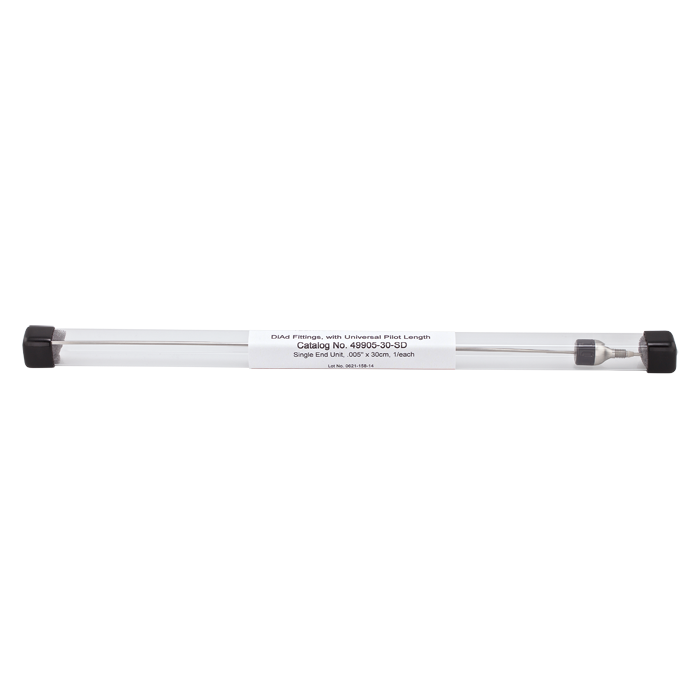 This Di-Ad™ is very convenient for laboratories that use multiple column brands and want to use 0.005" (127um) ID x 300mm (11.81") long tubing with perfect cut tips. Pressure rating for these connectors is 10,000 psi and are HPLC solvent resistant.