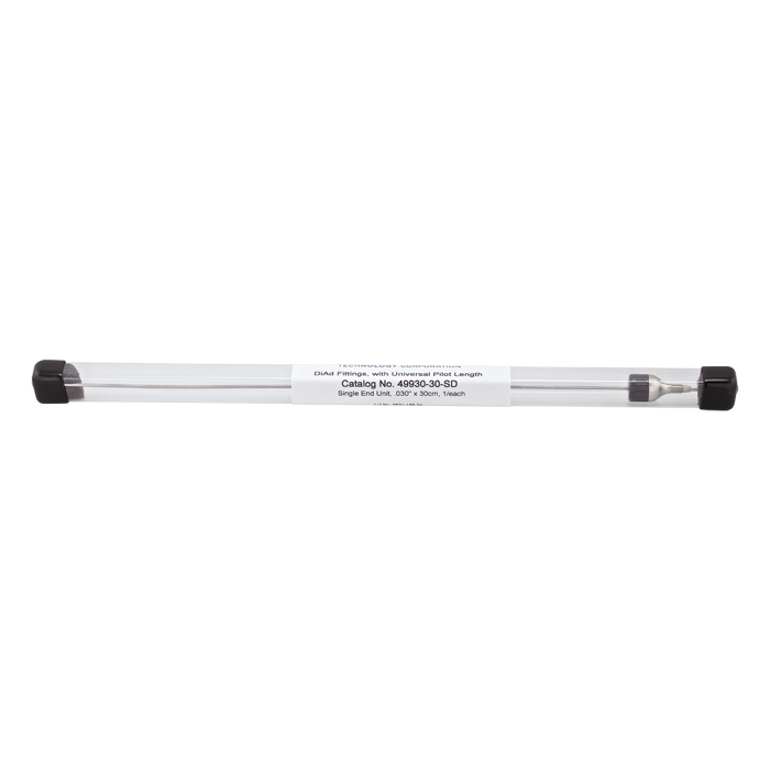 This Di-Ad™ is very convenient for laboratories that use multiple column brands and want to use 0.030" (762um) ID x 300mm (11.81") long tubing with perfect cut tips. Pressure rating for these connectors is 10,000 psi and are HPLC solvent resistant.