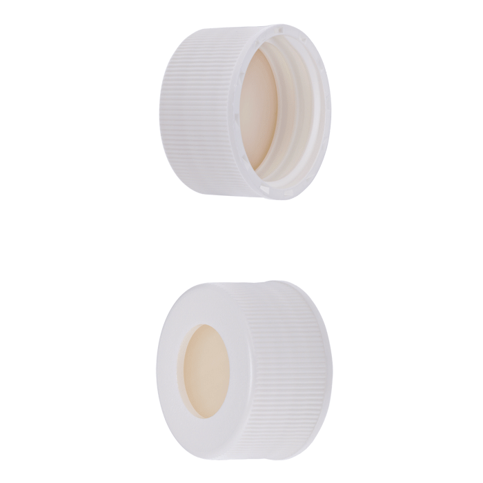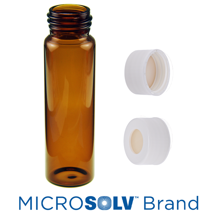 Vial & Cap Kit includes 100 EA 40mL, Screw Top, Glass, EPA Style vials, Amber and 100 EA matching Screw Caps with Silicone Rubber / White PTFE Septa, fitted in the white caps. MICROSOLV Brand Easy Purchase Pack. 1/PK.