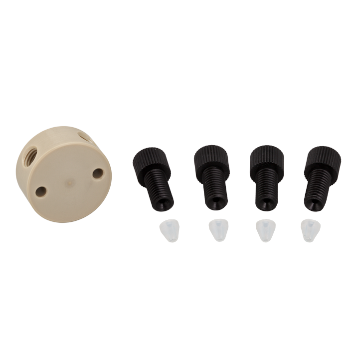 Union, Connector Kit, Cross, high pressure, 0.8 mm / 0.031 inch through hole with 1/4-28 screw threads. PEEK, round with an internal "X" flow pattern. Use with 1/16 inch tubing. ARE-Applied Research brand. Bulk Price.