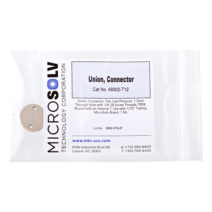 Join three pieces of tubing with similar 1/4-28 connectors. This "three way T" union allows for 3 pieces of tubing to be joined into one flow or for one flow to be split in the low pressure zone of HPLC.