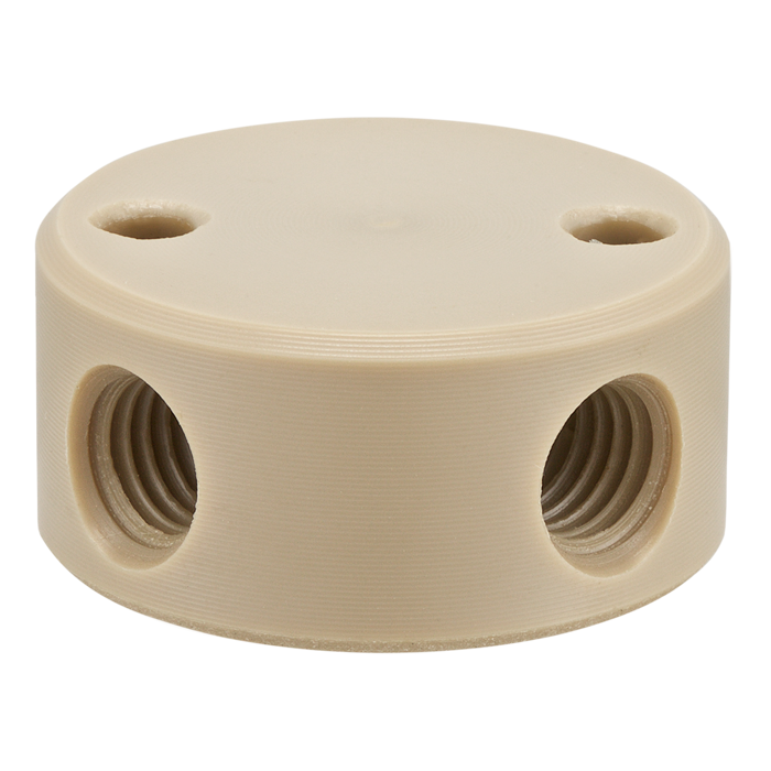 Union, Connector, Tee, low pressure, 1.5 mm / 0.060 inch through hole with 1/4-28 screw threads. PEEK, round with an internal "T". ARE-Applied Research brand. Bulk Price.