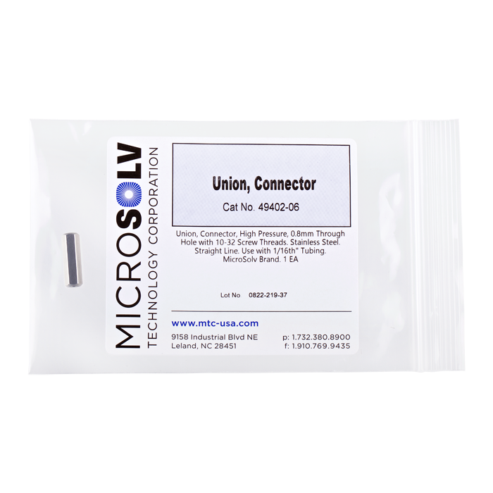 This stainless steel union has two 10-32 threaded female port / connections that allows you to combine high pressure flow of liquid with 0.8 mm / 0.031-inch ID tubing in a straight line.
