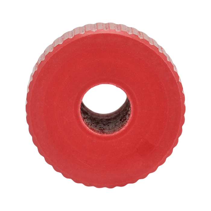 Tubing Connector Nuts, low pressure, 1/8 inch, PEEK, Red with 1/4-28 screw threads, for use with flange free, polymeric tubing. ARE-Applied Research brand. Bulk Price.