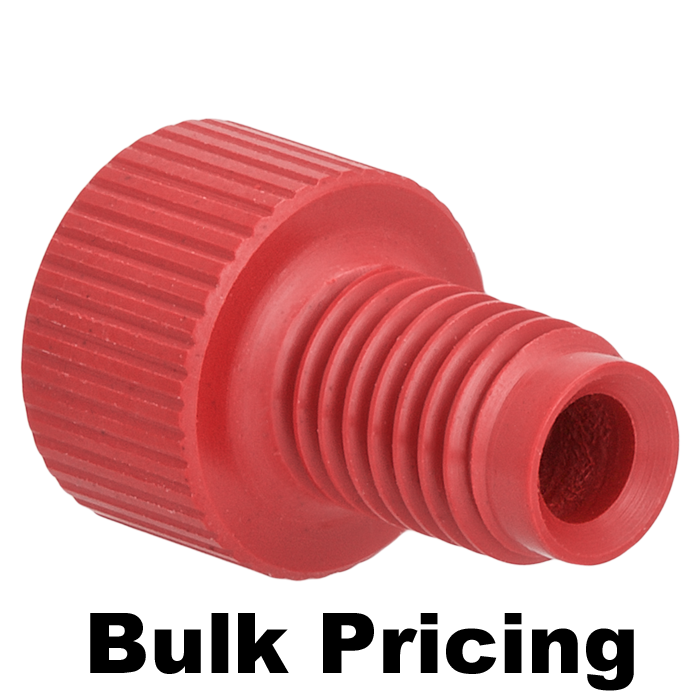Tubing Connector Nuts, low pressure, 1/8 inch, PEEK, Red with 1/4-28 screw threads, for use with flange free, polymeric tubing. ARE-Applied Research brand. Bulk Price.