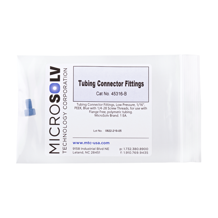 These tubing connector nuts are used to connect 1/16th inch (1.6 mm) OD polymeric tubing in the low pressures zones of HPLC systems and other low pressure, fluidic uses.