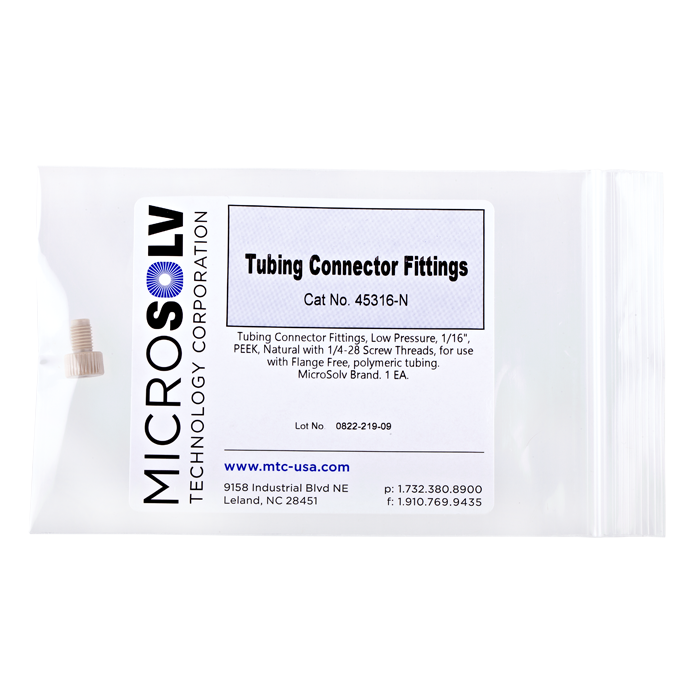 These tubing connector nuts are used to connect 1/16th inch (1.6 mm) OD polymeric tubing in the low pressures zones of HPLC systems and other low pressure, fluidic uses.